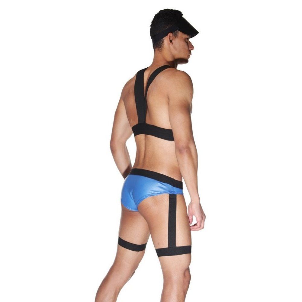 Ролевой костюм агента FBI для мужчин из трех предметов. Черный козырек, топ из широких черных ремней и синих трусов с черным поясом и подтяжками. В комплекте: козырек, трусы-слипы с гартерами, топ.