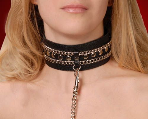 Изготовлен из натуральной кожи с велюровой подкладой. При изготовлении использована никелированная фурнитура. Размер универсальный. Ширина - 5 см. Длина цепочки (поводка) с карабином - 50 см.