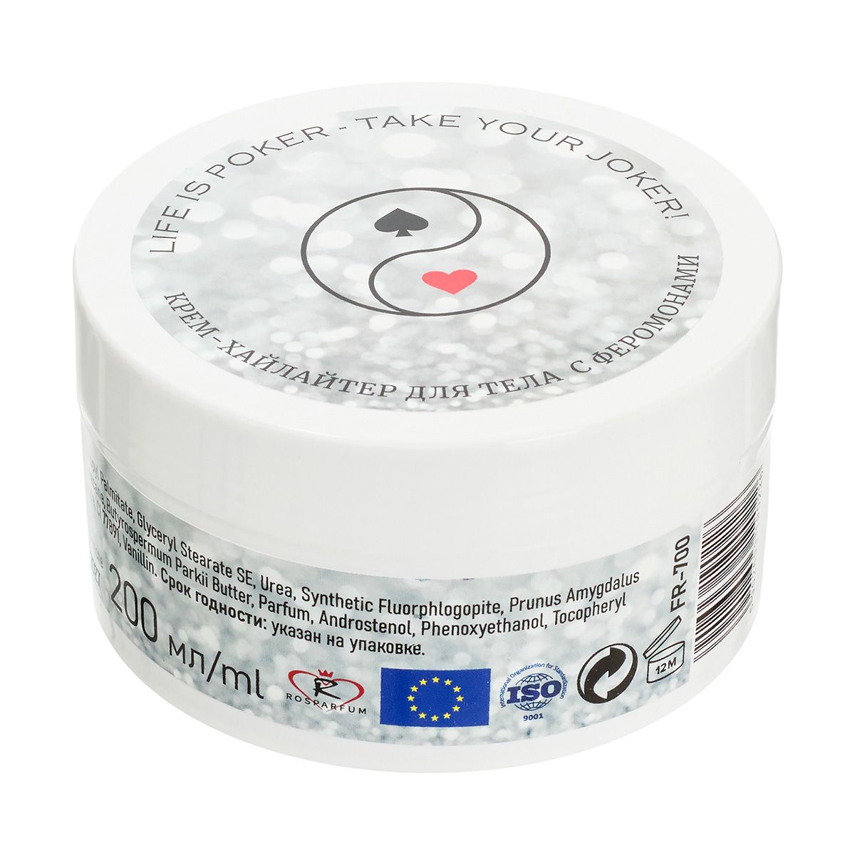 Крем для тела, подсвечивающий кожу переливающимися золотыми гранулами. При нанесении на кожу крем адаптируется к цвету Вашей кожи, оставляя лишь золотой блеск. Отличное средство, чтобы подчеркнуть гладкость и притягательность кожи, одновременно ухаживая за ней. В составе питательное масло сладкого миндаля, насыщенное масло каритэ, мочевина и витамин Е. Увлажняющие свойства крема сделают кожу напитанную влагой, а яркие сияющие серебристые частицы будут очень красиво переливаться под естественным и искусственным освещением. Крем стойкий и блеск держится несколько часов, не пачкает одежду. Феромоны в формуле придают соблазнительности и уверенности девушке, которая пользуется кремом, тем самым пробуждая ее природную сексуальность. Крем с ароматом ванили.